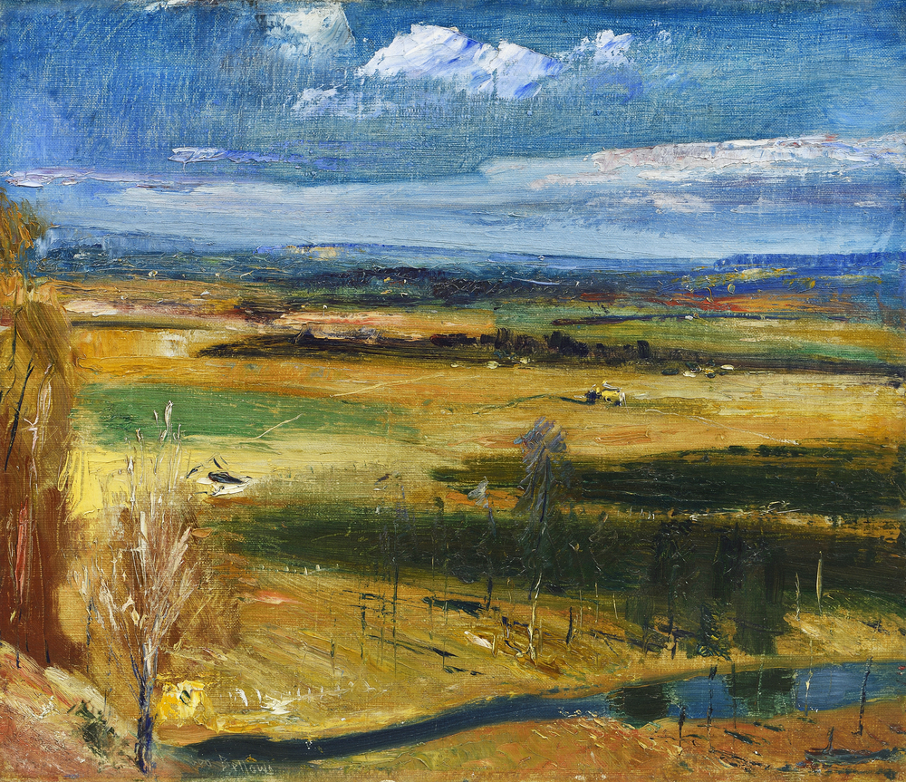 Clouds and Hills represents a view from the side of a hill, over a small river valley, and across a rolling landscape of fields and low hills….this painting is a highly accomplished rendering of aerial recession….Clouds and Hills is unusual in Bellows’s oeuvre not merely because it is a rural scene, but also because man’s presence is a very minor theme of the work….Clouds and Hills demonstrates Bellows developing his fluency in the handling of paint, and this may be seen as the major contribution of the Zion paintings as a group. Here, areas of thick impasto, applied by palette knife, are juxtaposed with smoother areas of thin brush-applied paint. Mastery of wet paint is demonstrated where Bellows has dragged the brush, or its end, through pigment to create the effect of branches or tree trunks. [David Setford in Love of Winter, p. 70]